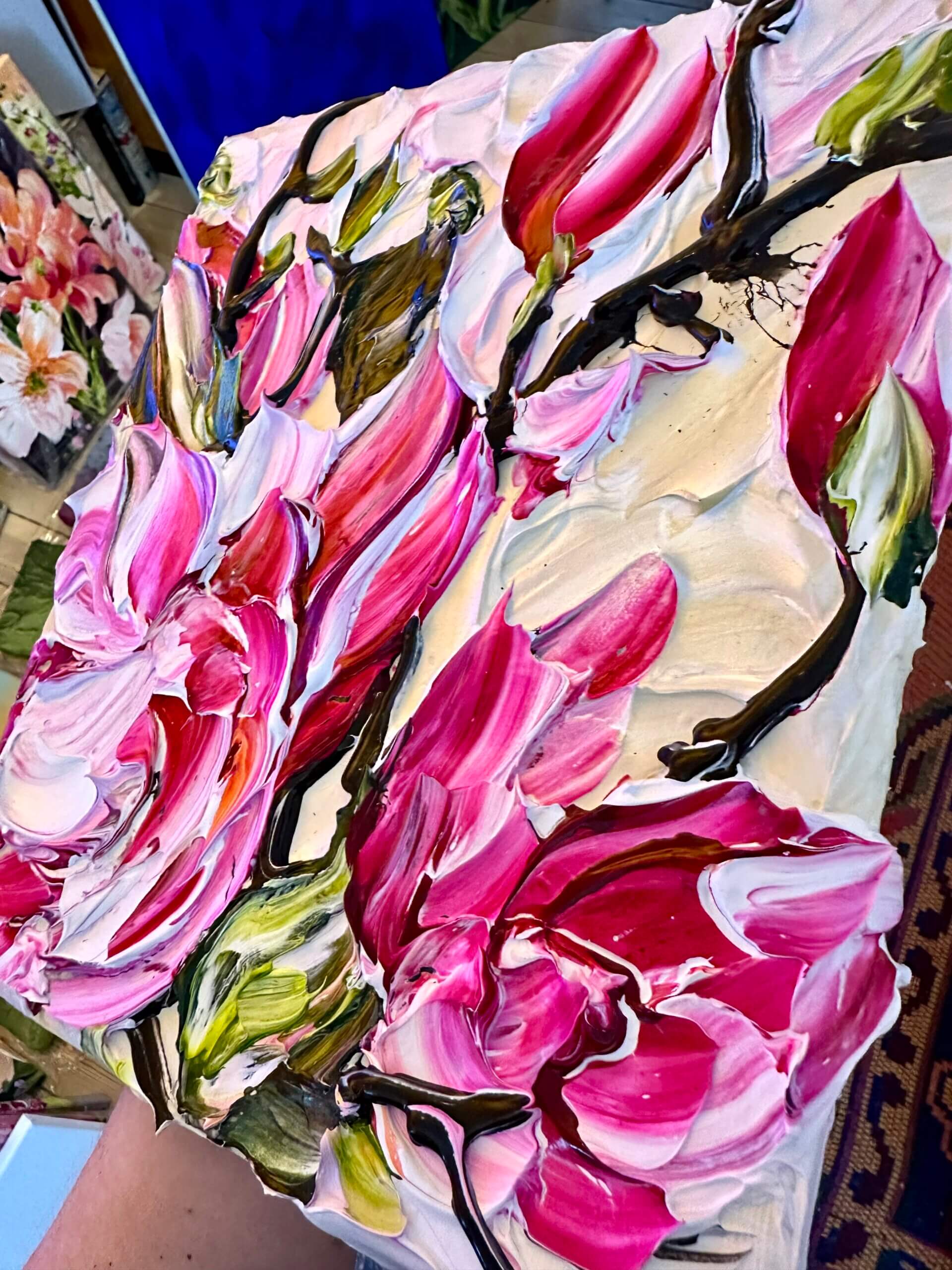 Værkerne er skabt af enormt store mængder maling, overfladen er dyb, dramatisk og sanselig. Hvert værk er unika og ingen strøg kan reproduceres.
