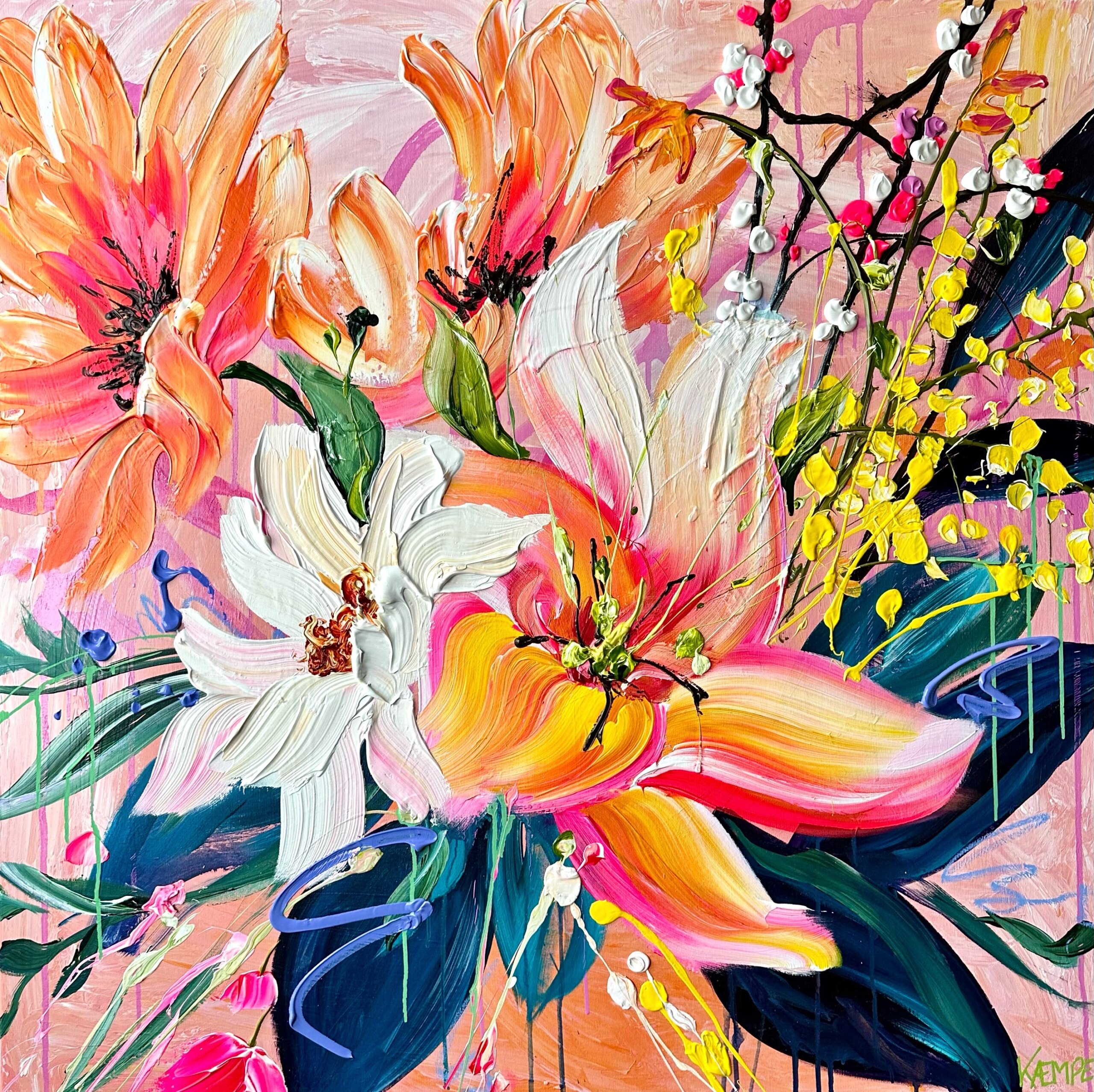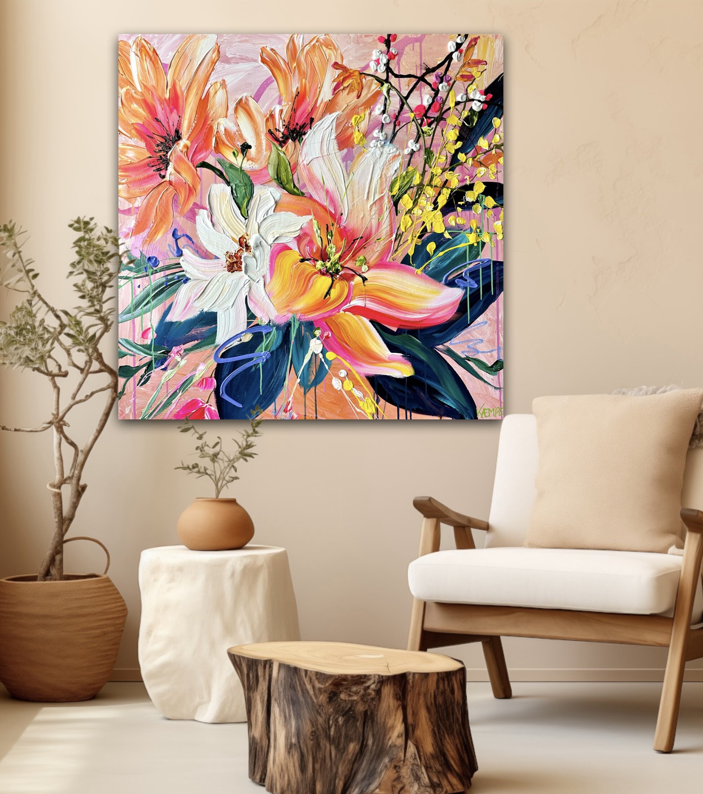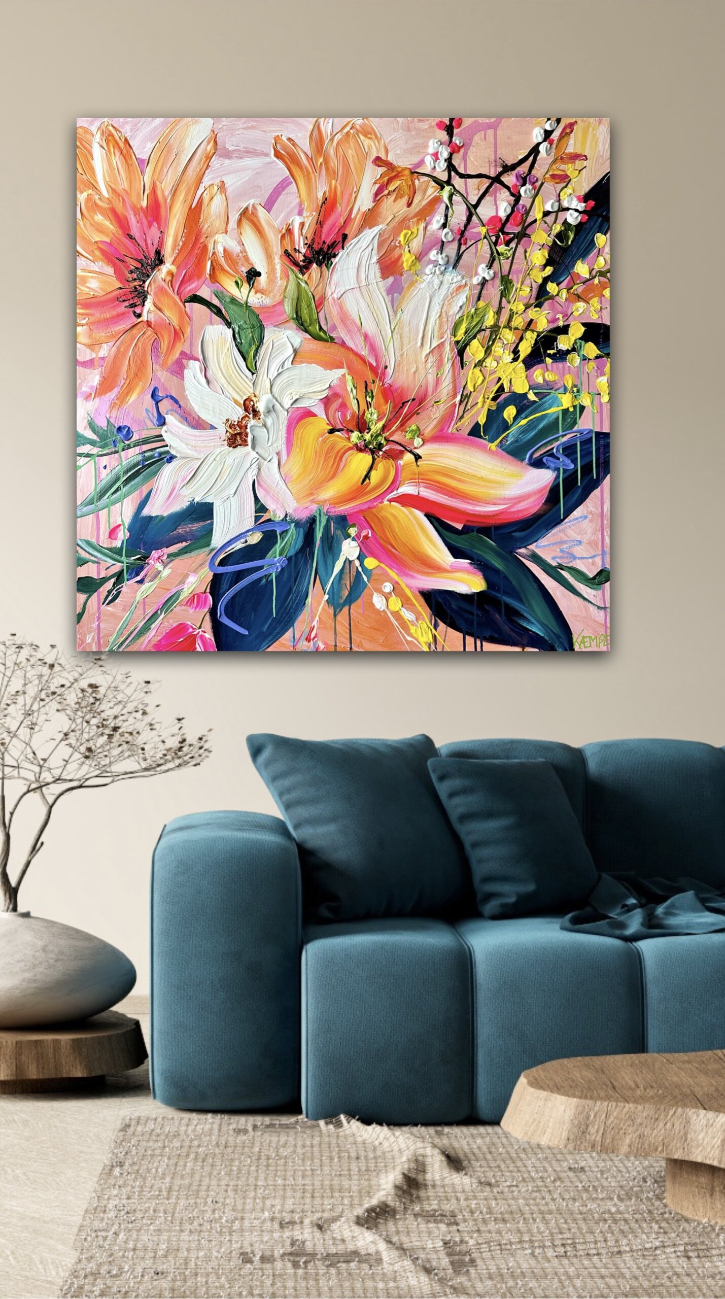 Hvert værk i serien er en hyldest til blomsterne, det smukke, opløftende og kraftfulde ved livet. Hvert maleri er skabt med tykke og grove lag maling, som skaber en tekstur der nærmest træder ud af lærredet. Disse malerier er ‘bold and powerful’, de kræver opmærksomhed – og får den, så snart du træder ind i rummet.