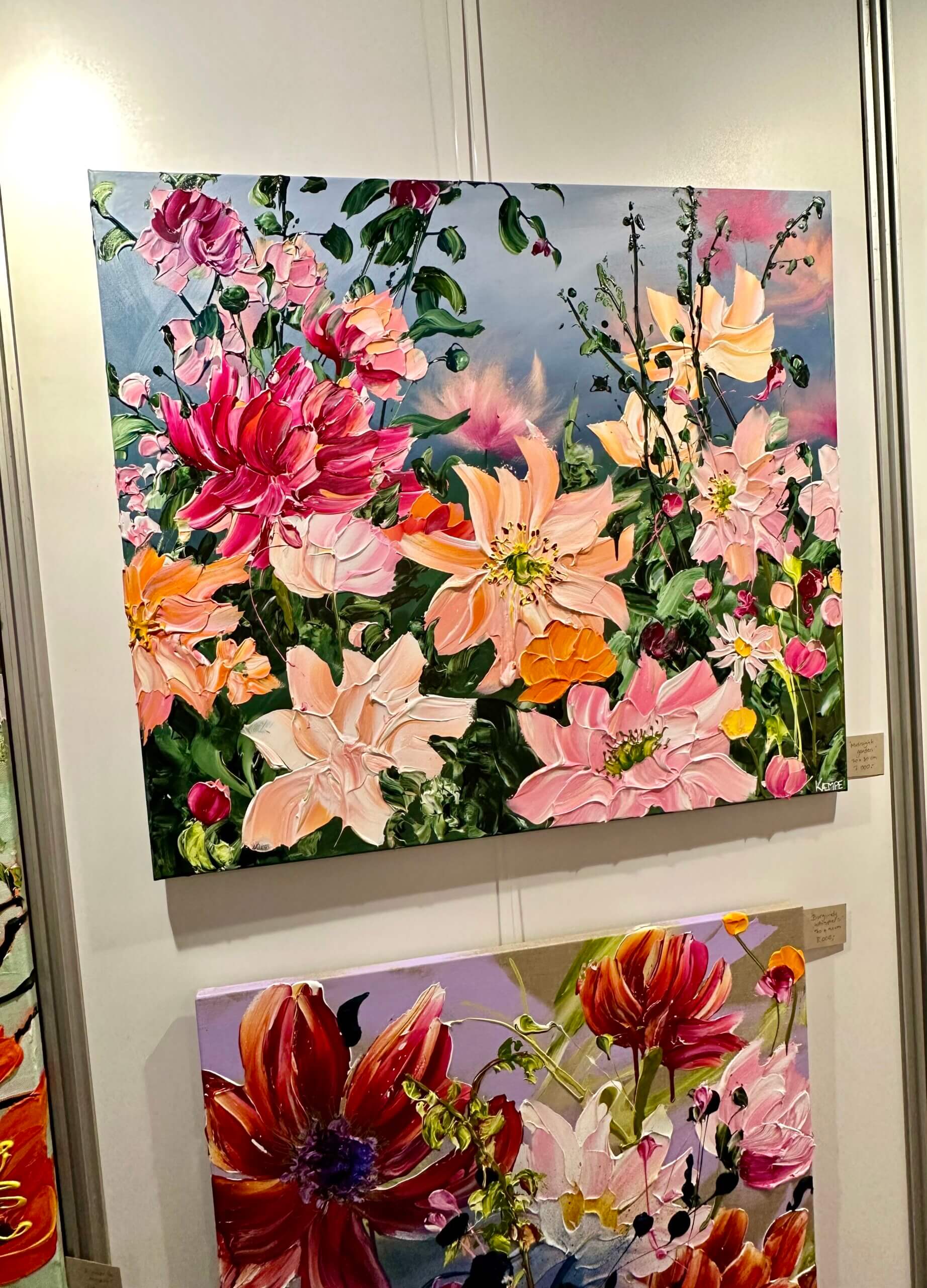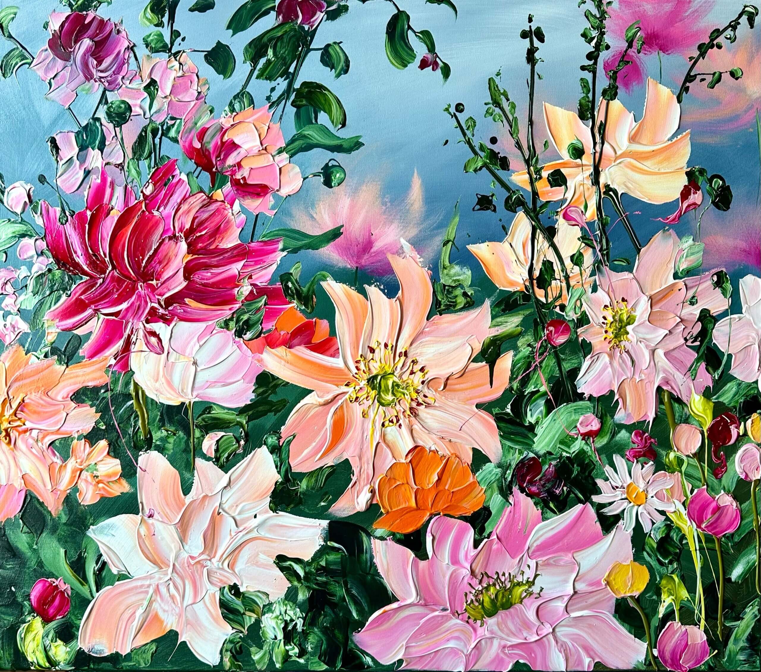 Hvert værk i serien er en hyldest til blomsterne, det smukke, opløftende og kraftfulde ved livet. Hvert maleri er skabt med tykke og grove lag maling, som skaber en tekstur der nærmest træder ud af lærredet. Disse malerier er ‘bold and powerful’, de kræver opmærksomhed – og får den, så snart du træder ind i rummet.